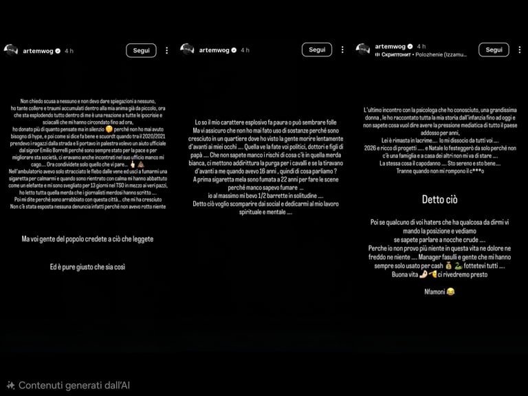 Un racconto da cui emerge un profondo senso di frustrazione anche per come l’episodio è stato raccontato dai media, “Ma voi, gente del popolo, credete a ciò che leggete. Ed è pure giusto che sia così”, prosegue Artem che in un passaggio riconosce il suo carattere spinoso riflettendo poi sulle difficoltà personali vissute negli anni e citando traumi e ferite interiori accumulati dall’infanzia. “Lo so, il mio carattere esplosivo fa paura o può sembrare folle – confida – Ma vi assicuro che non ho mai fato uso di sostanze perché sono cresciuto in un quartiere dove ho visto la gente morire lentamente davanti ai miei occhi”.