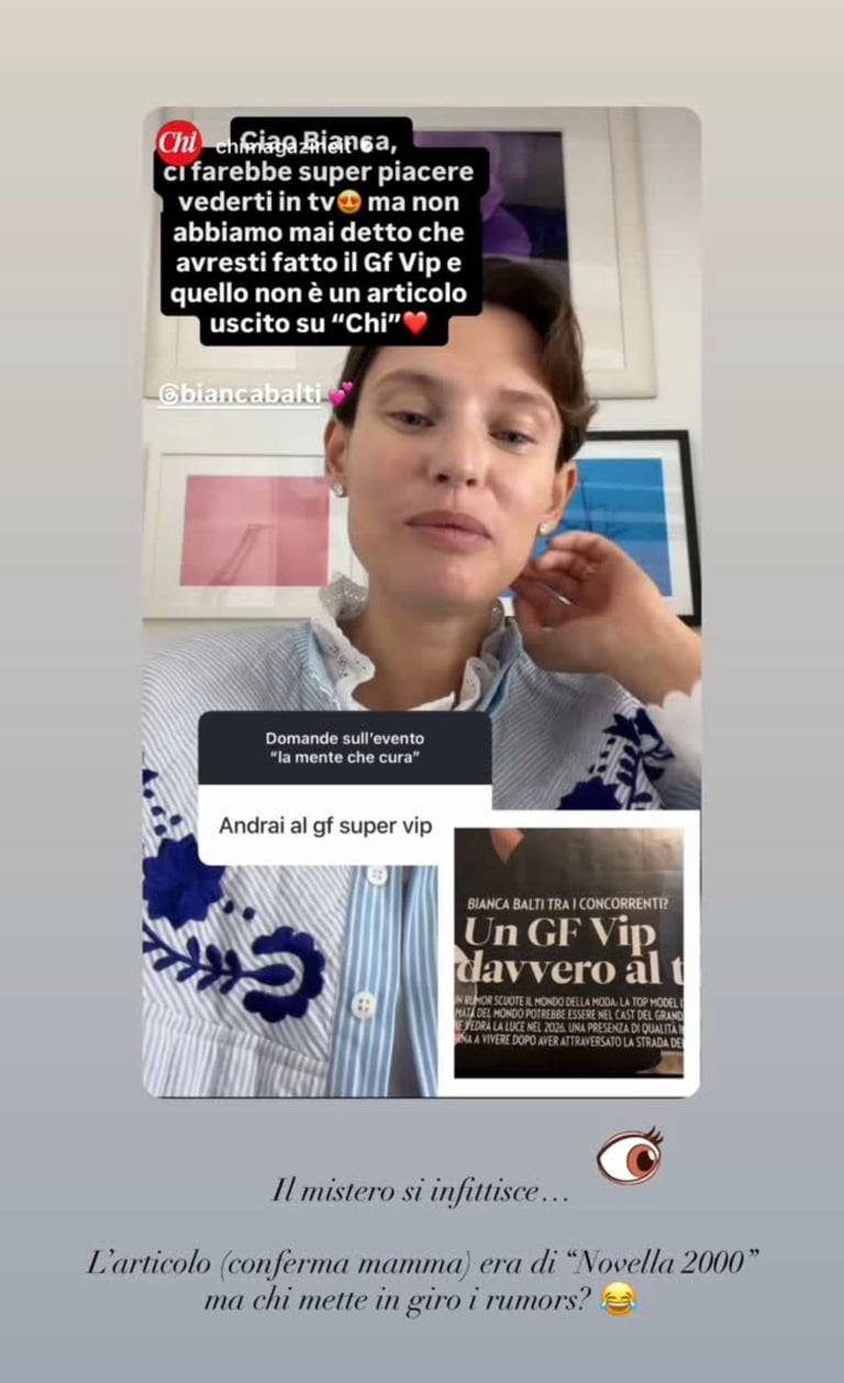 Ieri ha regalato uno spassoso siparietto mentre rispondeva alle domande dei follower su Instagram. Nei giorni scorsi, complice una notizia uscita su Novella 2000, era circolata la voce di una sua possibile partecipazione al Grande Fratello Vip. La madre di Bianca, dopo aver letto questo inconsistente scoop, ha inoltrato alla modella la foto del trafiletto.