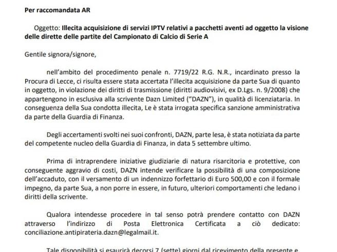 Negli ultimi giorni molti utenti italiani hanno ricevuto una raccomandata con ricevuta di ritorno o una PEC da DAZN, in cui la piattaforma chiede un pagamento di 500 euro per presunta visione illegale dei contenuti tramite servizi IPTV pirata, il cosiddetto “pezzotto”. La comunicazione arriva dopo le indagini condotte dalla Guardia di Finanza, che nei mesi scorsi ha identificato migliaia di persone coinvolte nell’utilizzo di abbonamenti illegali (pare oltre 2000 utenti) ed ha notificato in data 5 settembre il tutto alla piattaforma video.