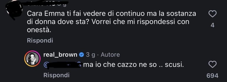 Sui social la cantante ha pubblicato un carosello di foto in cui indossa jeans e reggiseno. In molti hanno commentato complimentandosi per la sua forma fisica, ma come spesso accade non sono mancati i soliti utenti pronti a creare polemica. Di norma certe provocazioni vengono ignorate, ma questa volta Emma ha deciso di rispondere a due commenti in modo diretto.