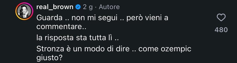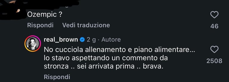 “No, allenamento e piano alimentare. Lo stavo aspettando un commento da str**za… sei arrivata prima… Brava. Guarda, non mi segui, però vieni a commentare. La risposta sta tutta lì. Str**za è un modo di dire… come Ozempic, giusto?”
