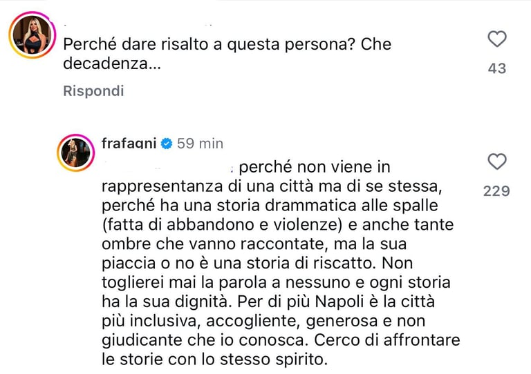 Un commento che è stato letto da Francesca, la quale ha deciso di rispondere così: