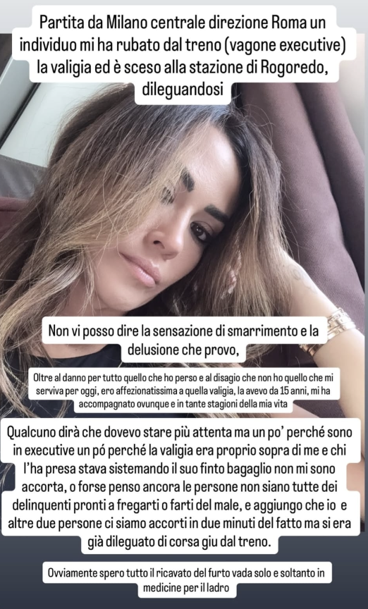 A raccontarlo è la stessa Palmas in una storia Instagram: “Partita da Milano centrale direzione Roma un individuo mi ha rubato dal treno (vagone executive) la valigia ed è sceso alla stazione di Rogoredo, dileguandosi”, scrive nel suo sfogo-denuncia. “Non vi posso dire la sensazione di smarrimento e la delusione che provo”, ha poi confessato.