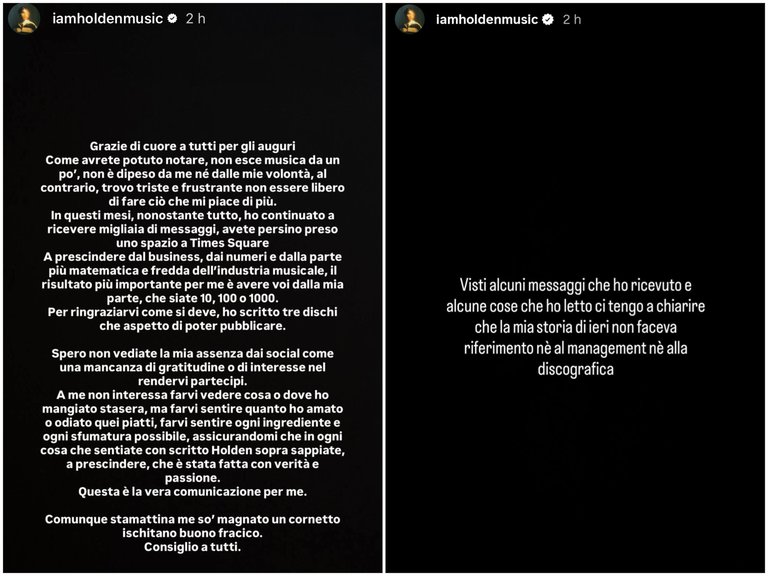 UPDATE Poche ore dopo la prima story, Holden ha pubblicato un nuovo contenuto social per chiarire le precedenti dichiarazioni a fronte di alcune speculazioni circolate in rete. “Visti alcuni messaggi che ho ricevuto e alcune cose che ho letto ci tengo a chiarire che la mia storia di ieri non faceva riferimento né al management né alla discografica”. Così si legge sul profilo Instagram.