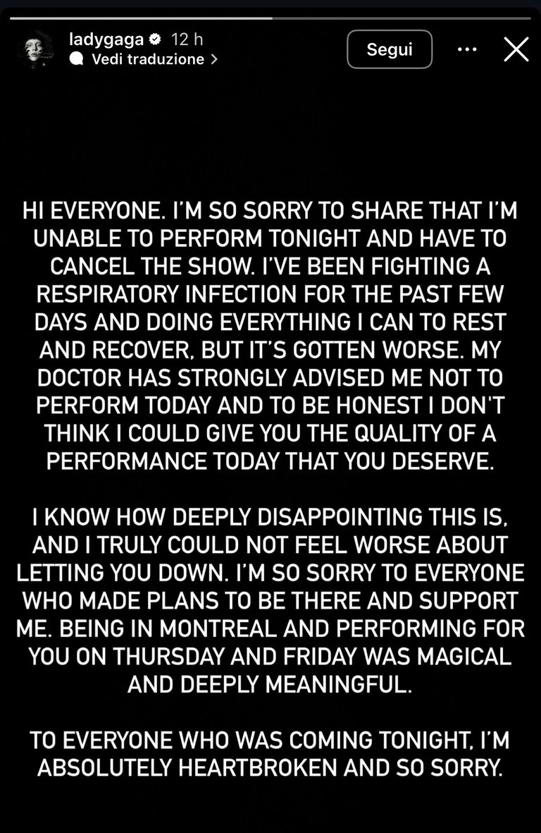 “Ciao a tutti. Mi dispiace moltissimo dovervi comunicare che non sono in grado di esibirmi stasera e che devo annullare lo spettacolo. Negli ultimi giorni ho dovuto affrontare un’infezione respiratoria e ho fatto tutto il possibile per riposarmi e riprendermi, ma la situazione è peggiorata. Il mio medico mi ha consigliato vivamente di non esibirmi oggi e, ad essere sincera, non credo di potervi offrire la qualità di spettacolo che meritate.”