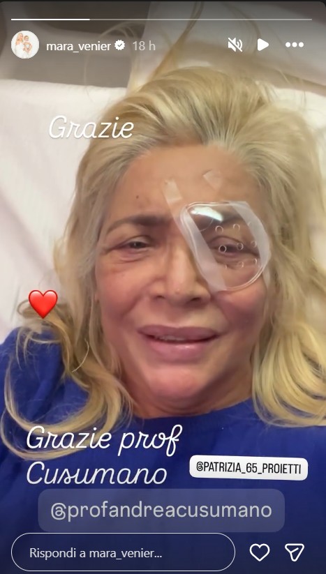 Mara Venier saluta il 2025 condividendo tramite una story Instagram direttamente dalla clinica in cui ha subito un piccolo intervento all’occhio. La storica conduttrice di Domenica In ha, infatti, svelato sui social di essere stata nuovamente sottoposta a una nuova operazione chirurgica per la quale ha ringraziato pubblicamente, nello stesso video online, il professor Andrea Cusumano che la segue.